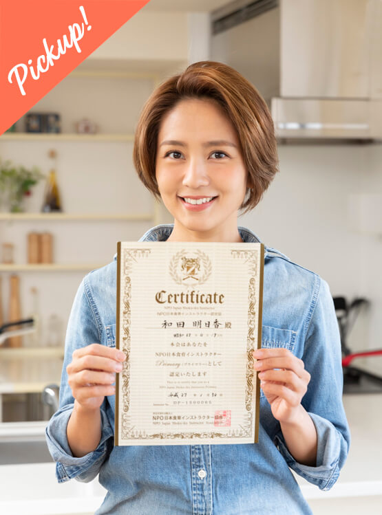 本講座を修了した方は、食育の普及・推進の一端を担う新しい力としての期待を込めて、食育インストラクターの資格認定が受けられます。 あなたが講座で習得した知識と技能を証明する価値ある資格です。